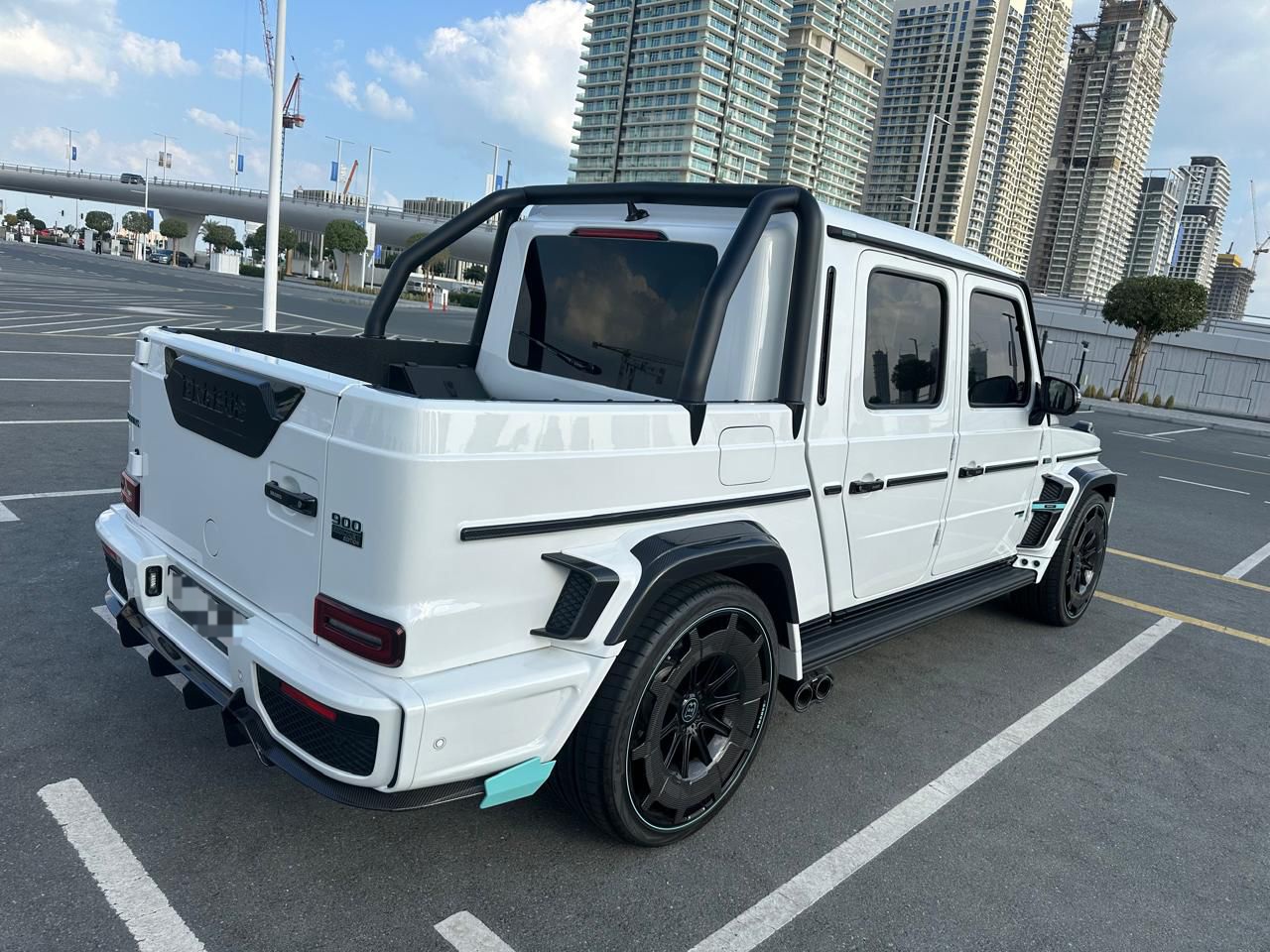 900 Horsepower: The tuned 4.4L or 4.5L twin-turbo V8 engine delivers 900 horsepower.  Brabus Rocket Body Kit: Features a widebody kit with exposed carbon fiber elements, a special front spoiler, side flaps, and a custom roof-mounted wing for enhanced aerodynamics.  Carbon Fiber Details: Extensive carbon fiber trim is used throughout the exterior and interior for a sporty and premium look.  High-Performance Tires: Equipped with performance tires for optimal grip and handling.  Luxury Interior: Custom leather and high-tech features create a luxury interior.  Limited Edition: The "1 of 25" designation indicates it's part of a very exclusive series.  Advanced Features: Often includes advanced safety and comfort features like a 360-degree camera, adaptive cruise control, and sport suspension.